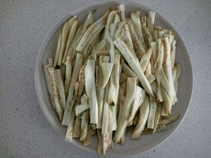 茄子洗干净去皮切成条,摆盘备用,上锅蒸15-20分钟,熟了即可。