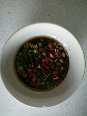 将所有的调味料混合,加入切好的蒜和辣椒。