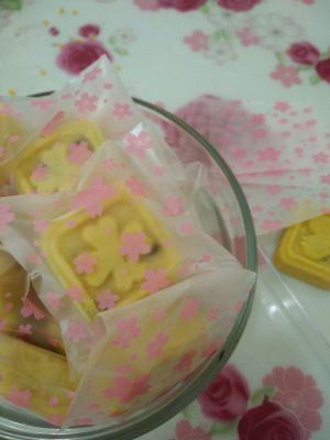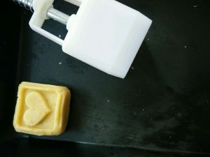 选择自己喜欢的花片嵌入模具,然后将包好馅料的绿豆泥放入,摁出花纹。