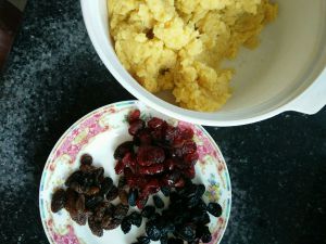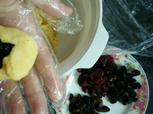 放凉后就可以来包了!自家的口味随意选择,想放什么干果就放什么干果。我做了三种口味,蔓越莓,黑加仑,葡萄干。。