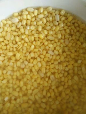 去皮绿豆加入清水浸泡一夜,由于天气过热,需放入冰箱。