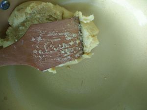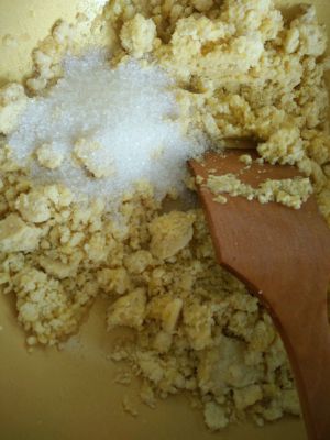 黄油完全融化后,将压好的绿豆泥倒入锅中稍微翻拌一下,加入细砂糖。