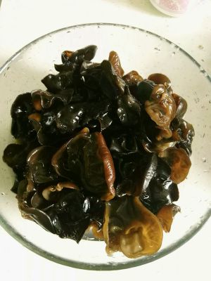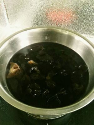 干木耳用水浸泡两个小时以上,去掉木耳上面的根儿