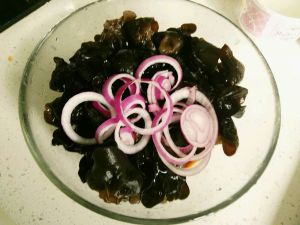 把过好水的木耳放入容器内,加入,生抽,糖,醋,洋葱拌匀