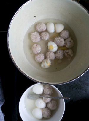锅里煮水,水开始冒泡后,把鱼丸下锅煮,鹌鹑蛋也一起放下去。