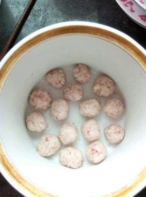 把生粉和一点点盐放进肉泥,搅拌均匀以后,放置十几分钟,捏成团状