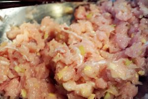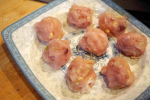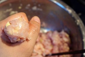 其实可以一边挤一边放锅里,我纯属为了摆拍。因为搅拌时间短,外加葱姜切的不够细,挤出的丸子张牙舞爪~