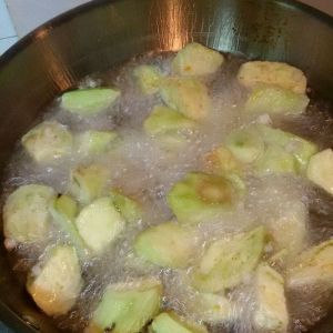茄子洗净,去皮,切菱形块,用水浸泡5分钟,把水倒出。取干淀粉适量,倒入小盆中,茄子沾满淀粉。油锅烧开,沾好淀粉的茄子下锅,炸至变黄色且表面变硬,捞出备用。
