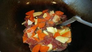 锅内放油加入胡萝卜冬笋香肠炒匀后加入豆刀,放适量盐调味