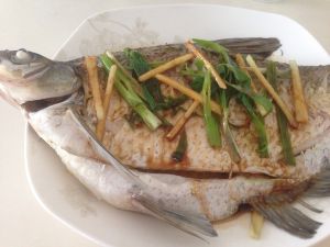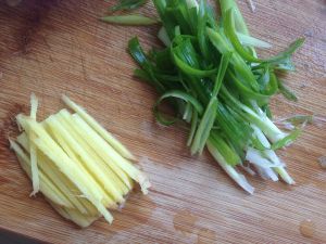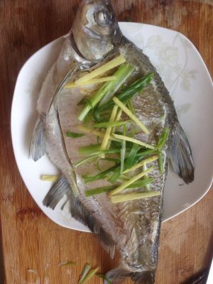 蒸好的鱼拿出来把汤汁倒掉,把蒸鱼时的姜葱去掉铺上新的葱和姜