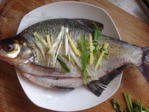 新鲜鱼一条(鳊鱼鲈鱼武昌鱼罗非鱼都行,今天买的是鳊鱼)清洗干净晾干,表面涂少许盐和料酒腌制一下