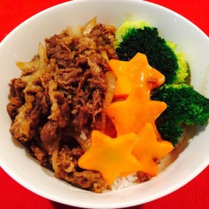 盛好一碗米饭,把肥牛、西蓝花、胡萝卜摆好,最后撒上一些汤汁~~美味的肥牛饭上桌啦!