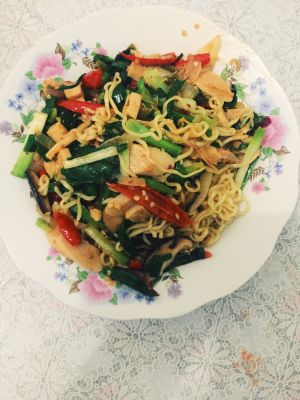 第七步 方便面入锅 加入韭菜 放盐 味精 鸡精 煸炒一分钟 出锅