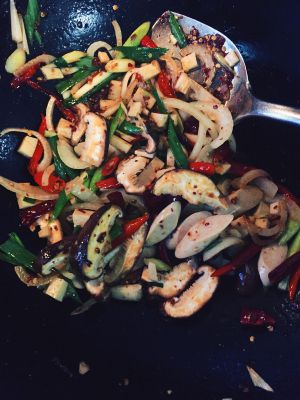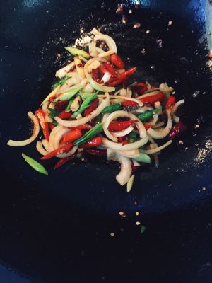 第四步 把切好的洋葱 蒜苗 辣椒 放入锅中煸炒 炒香