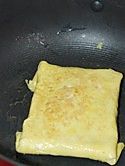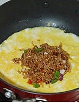 倒入打撒的蛋液,一直转动锅子时使蛋液均匀的铺开,稍稍凝固,放入炒饭,两边向中间折起。