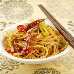开大火下入青红椒,翻炒几下,放入土豆丝,翻炒1分钟左右,放入白醋,生抽,油辣子翻炒几下再放入盐,继续翻炒,炒2-3分钟左右,土豆丝上色后放入鸡精关火盛出装盘即可。