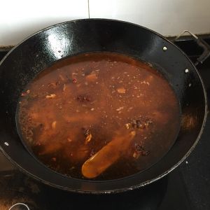 鸭子炒干水分后放入泡菜,酱和火锅底料