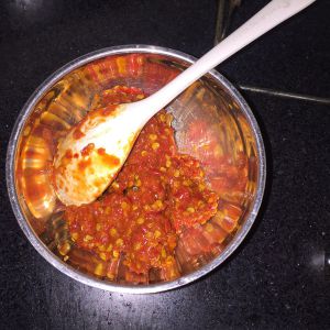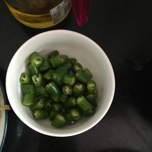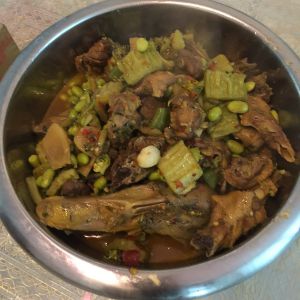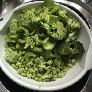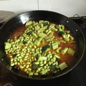 放入青豆苦瓜焖至汤汁收浓时放入青椒,倒点老抽上色鸡精,如果味淡加点。
