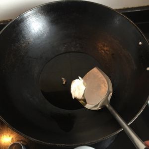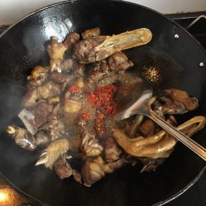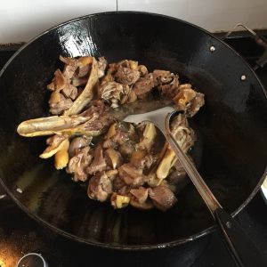 过水后的鸭子下油锅炒干同时放入姜片蒜花椒料酒翻炒