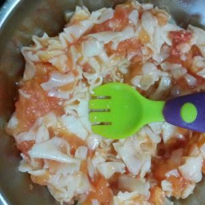 放西红柿加一点点糖(一岁以下的可不加糖)炒至番茄酱样子。把面片虾仁加进去翻炒片刻就可以起锅了。