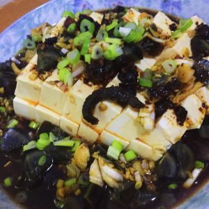 皮蛋切小块摆盘,浇上汁,最后加上辣豆豉撒上葱花点缀即可。