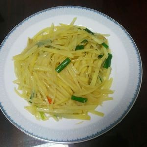热油,辣椒爆香,放入土豆丝,炒至九成熟下葱段,下醋(陈醋),盐,炒熟即可!