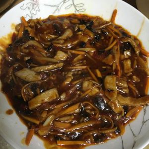 锅中余油加入胡萝卜丝,木耳丝炒熟捞出备用。