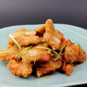 锅内烧热油至七成热时,将抓好的肉片一片一片放入油锅中,每次不要炸太多,每次炸五片即可,炸熟捞出,待油温升至八成热放入油锅复炸,至外皮酥脆颜色金黄即可!
