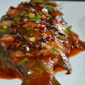 放少量醋,适量料酒生抽老抽,加水淹没鱼身三分之二,放蒜瓣、辣子鸡、白糖少量,盖锅盖,焖煮至少量汤汁,中途用汤汁淋鱼身保证鱼身入味均匀,撒葱末小米椒圈装饰,装盘淋汤汁,淋少许蒸鱼豉油。ok