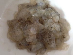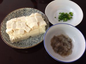 豆腐用清水冲洗干净后装盘切小块,虾茸加料酒、盐、蛋清拌匀,葱切成葱花