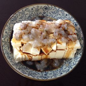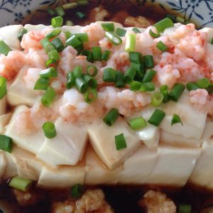 把虾茸放在豆腐上,淋上生抽。蒸锅加水煮开后放入豆腐蒸十分钟即可