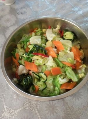 然后将处理好的黄瓜、圆白菜和胡萝卜,还有5片姜,放入晾凉的糖醋溶液中,拌匀后放入冰箱冷藏5小时左右即可食用(腌制越久,越入味)
