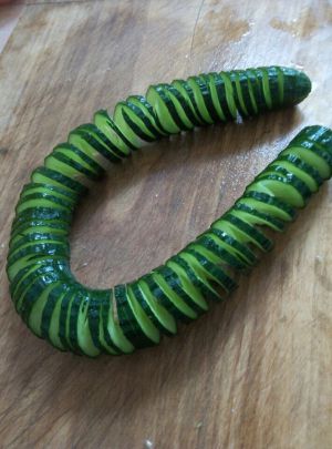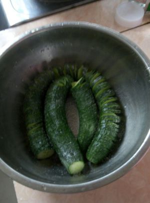 黄瓜切成蓑衣黄瓜,如果刀工不好,可以借助一根筷子
