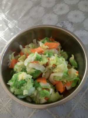 圆白菜和胡萝卜焯水,切记不要焯过,不用等其开锅,烫10秒钟就立刻捞到凉水盆中过凉,然后再用凉水冲一遍,这样才会有脆脆的口感
