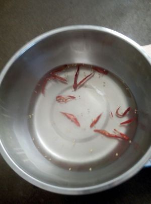 干辣椒剪成丝后放入盆中,将盆放到火上,煮开后,关火,再放入15g盐,用筷子将盐和糖搅拌均匀,晾晾备用