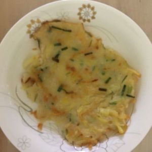 平底锅加入色拉油预热,混合好的粉浆根据平底锅大小分成若干份,我们家的锅比较大,分成三份即可摊完。摊饼时要薄而均匀,粉浆受热均匀,土豆丝会也会煎得很脆。两面煎成金黄状态即可出锅。