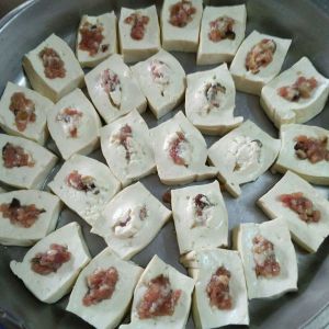 盐水豆腐,前上肉末,加盐、油、酱油、生粉,蚝油腌了备用,用量看自己的材料定哦,豆腐中间筷子扎孔用筷子塞肉进去,这个动作要注意点哦,大力了豆腐容易列开哦,弄好放平底不粘锅煎至两面微黄,沙锅底下按自己口味用大白菜或苦瓜或豆芽或三鲜菇都行煲几分钟,洒上胡椒粉就可以桌了