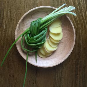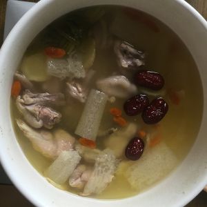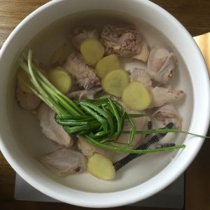 砂锅中放入炒好洗净的鸡块,姜片和葱,放入适量的水,大火烧开转小火慢炖1.5小时左右,至鸡肉软烂。