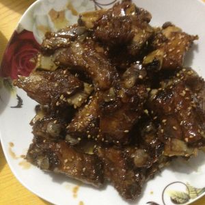 酱汤汁倒入锅内'放入炸好的排骨'熬至粘稠''出锅'''
