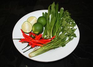 泰国柠檬挤汁,大香菜,小香菜切段,红小米椒切粒