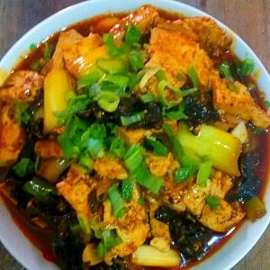 将煮过的豆腐放入油锅内,加麻婆豆腐料,豆腐乳,木耳