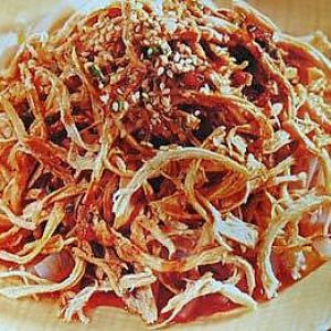 用擀面杖,把鸡肉敲松!去皮,把鸡皮切成丝。拍松的鸡肉撕成丝。ps.请按照鸡肉的纹路撕!