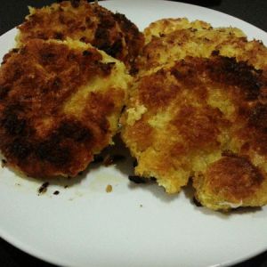 每块饼放入蛋液中,再在面包屑中滚一圈,放到锅中煎熟两面至金黄。