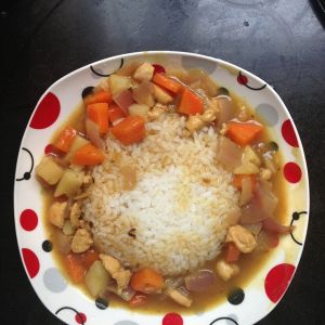 一次放入胡萝卜.土豆.洋葱.鸡肉.翻炒几分钟后.加入4/3的开水。在放咖喱块.收汁。