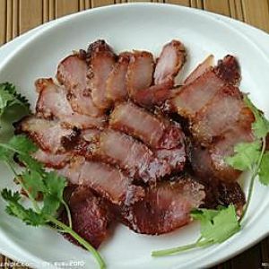 在猪颈肉中放入料酒、叉烧酱、豉油鸡汁、姜蓉,腌制3小时,其间翻转二次。