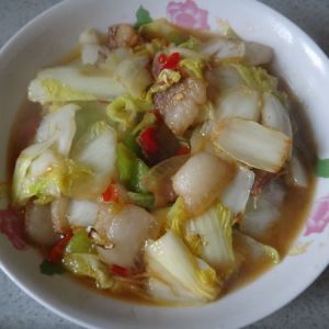 然后加入倒入大白菜煸炒,再加入青椒煸炒,这时候加入盐煸炒