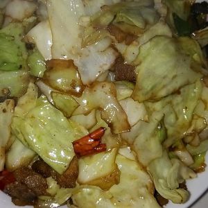 锅烧热后放入五花肉翻炒,焦黄时放入生姜、辣椒、花椒、生抽,翻炒一下后倒入包菜