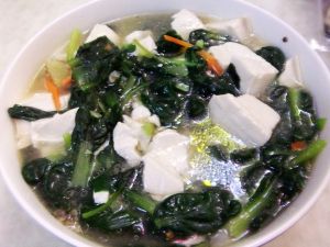 接着,倒一碗开水倒锅里,煮开后,放入豆腐、少许盐、胡萝卜丝、蒜叶,再次煮沸后出锅。倒些胡椒粉,搅匀即可使用。