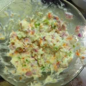 将洋葱丁,火腿丁,熟芹菜丁,土豆泥一起放置容器内