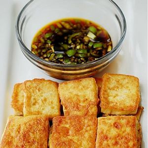 豆腐块放鸡蛋液沾均匀;油烧7成热,放入蘸鸡蛋液的豆腐块;